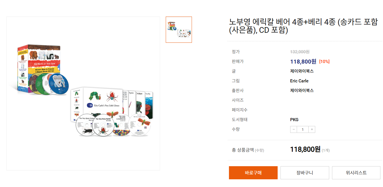 노부영 베렌스테인 베어 베스트 6종, 노부영 에릭칼 베어 4종 (CD포함), 노부영 마이퍼스트 스팟 10종(송 CD포함), 노부영 마이퍼스트 위씽 6종 (송 CD포함), 노부영 뉴위시워시 30종 NWWR 1~30 (Book & CD), 노부영 닥터수스 보드북 12종 (오디오 포함)
